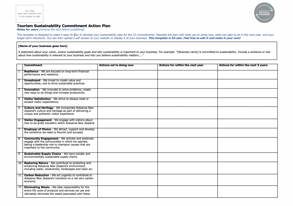 This Word template* is designed to help you make a prioritised Action Plan for your sustainability activities. Use the ideas, tools and resources on this website to work out what you need to do to meet each of the 12 Commitments. Think about the things you can do now, what you could achieve in the next year, and what may take longer. Review your plan regularly, and perhaps even display it in a prominent area as a reminder of the actions you've planned.